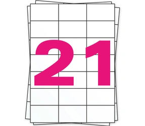 Einer unserer Din A4 Stickerbögen ist das Modell mit 21 Stickern pro Bogen. Diese Aufkleber bestehen aus 70 gramm weißem Papier. Die Rückseite wiegt 55 gramm. Die Sticker haben eine permanente Klebkraft. Die Aufkleber sind geeignet für alle Inkjet Drucker, Laserdrucker, Offset Drucker und Kopierer. Eine Verpackung enthält 100 A4 Etikettenbögen, also 2100 Aufkleber. Die Aufkleber haben die Maße 70mm x 42,4mm. Die Etiketten werden häufig als Versandetiketten verwendet.