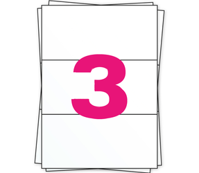 Einer unserer Din A4 Stickerbögen ist das Modell mit 3 Stickern pro Bogen. Diese Aufkleber bestehen aus 70 gramm weißem Papier. Die Rückseite wiegt 55 gramm. Die Sticker haben eine permanente Klebkraft. Die Aufkleber sind geeignet für alle Inkjet Drucker, Laserdrucker, Offset Drucker und Kopierer. Eine Verpackung enthält 100 A4 Etikettenbögen, also 300 Aufkleber. Die Aufkleber haben die Maße 210mm x 98,5mm. Die Etiketten werden häufig als DHL Versandetiketten oder Hermes Versandetiketten verwendet,